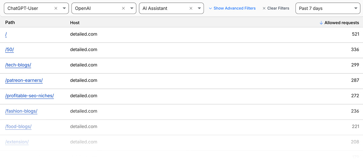 Below we can see when ChatGPT-User required pages on Detailed.com over a seven-day period.