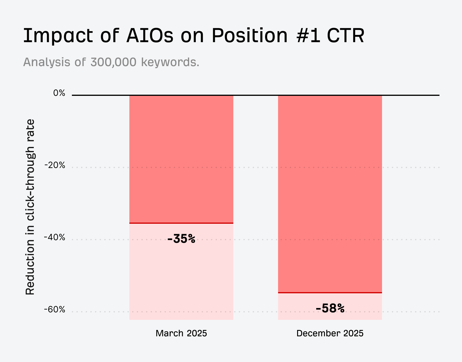 Back in April 2025, we found that AI Overviews reduced clicks to top-ranking content by 34.5%, despite Google’s statements to the contrary.